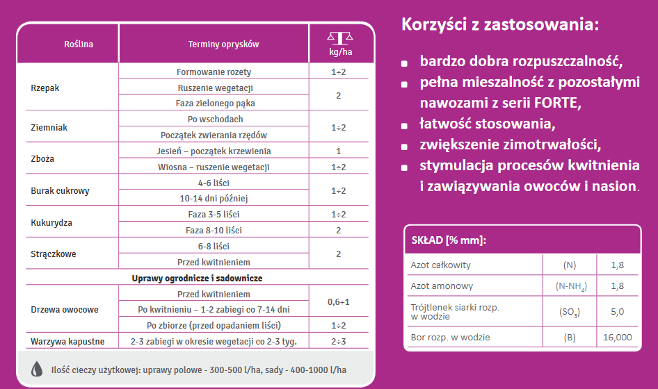 BORforte to doskonale rozpuszczalny nawóz z wysoką zawartością boru oraz dodatkiem siarki i azotu. Nawóz zalecany do stosowania w uprawach, które wykazują duże zapotrzebowanie na bor. W uprawach rzepaku nawóz wpływa na prawidłowy rozwój szyjki korzeniowej oraz stymuluje rozwój łuszczyn. W uprawach buraka przeciwdziała zgorzeli liścia sercowego oraz zgniliźnie korzeni. Bor wpływa także na procesy kwitnienia i owocowania.