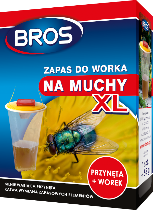 Zapas do worka na muchy XL - wyjątkowo skutecznej i bardzo pojemnej pułapki do monitorowania obecności much na terenach otwartych poprzez ich odławianie. Wyłapywanie much pozwala na wykrycie obecności tych owadów i ocenę ich ilości. Muchy wabione są naturalną, nietoksyczną przynętą umieszczoną wewnątrz pułapki, a specjalna konstrukcja produktu uniemożliwia wydostanie się ich ze środka. Pułapka nadaje się do monitorowania zdecydowanej większości gatunków much występujących na terenie Polski. BROS zapas do worka na muchy XL umożliwia wielokrotne wykorzystywanie jednej pułapki. Wystarczy wymienić w niej dwa wchodzące w skład zestawu elementy: