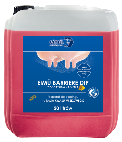 GOTOWY DO ZASTOSOWANIA ROZTWÓR POUDOJOWEJ KĄPIELI STRZYKÓW NA BAZIE KWASU MLEKOWEGO. Gotowy do użycia roztwór o działaniu dezynfekcyjnym, w którym zanurza się strzyki po doju (dipping). Tworzy na skórze strzyków warstwę pielęgnacyjno-ochronną. Skóra strzyków i przewód strzykowy zostają skutecznie zabezpieczone przed przedostawaniem się drobnoustrojów i zanieczyszczeń do wnętrza wymienia.Gliceryna zawarta w eimü – BARRIERE DIP z dodatkiem nagietka utrzymuje skórę strzyków gładką i elastyczną, przyczyniając się do poprawy jej odporności, natomiast kwas mlekowy stwarza skuteczną naturalną zaporę przed drobnoustrojami, a szczególnie bakteriami. Dzięki nieściekającej powłoce ochronnej końce strzyków i kanały strzykowe są właściwie zabezpieczone przed zanieczyszczeniami i czynnikami chorobotwórczymi występującymi w środowisku naturalnym, co wspomaga zdrowotność wymion.