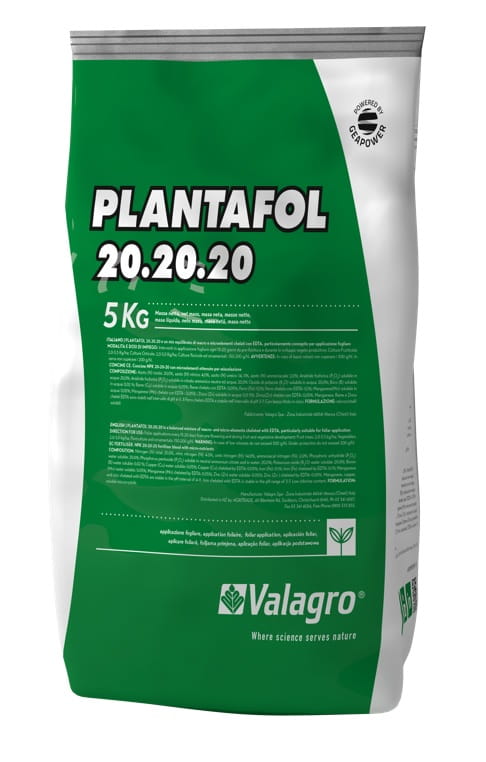 PLANTAFOL to nawóz dolistyny z firmy Valagro. Zrównoważona mieszanka makro i mikroelementów schelatowanych przez EDTA, wzbogacona w specyficzne środki powierzchniowo czynne, do stosowania w różnych fazach rozwojowych roślin uprawnych. Plantafol to pełna gama wysokiej jakości dolistnych nawozów N-P-K dobranych tak, aby w pełni zaspokoić potrzeby pokarmowe uprawy na rożnych etapach rozwoju. Plantafol zawiera substancje ułatwiające wnikanie składników mineralnych do liści. Roztwór nie krystalizuje na powierzchni liścia, a dzięki dłuższemu zwilżeniu całkowicie wnika do rośliny. Mikro kryształki są całkowicie rozpuszczalne w wodzie.
